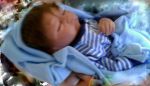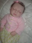 This is my first reborn. He was made from the Zoe (Zoey?) kit that I purchased from Hobby Lobby. I worked on him based on the instructions in the kit and gave the bald baby to my mom for her birthday in July. As I researched more, I asked for him back, repainted him, added hair and weighted him with beads. I entered him in the "county fair" and he won 2nd place. I made several mistakes - including making him too blue with my internal wash. In fluorescent lights he looks a bit morbid! I got the best pics in warm afternoon sunlight. Does anyone have advice on the internal wash?