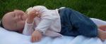 She is the Jonas sculpt by Eva Walkobinger. She wears a 0-3 months. I love the fact I can find cute clothes that fit her! She is a big girl, relative to the other her dolls we usually work on. I can't remember her length but it is somewhere around 23 inches.