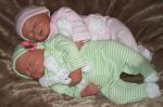 Okay...Little miss Tow head is finished...I think. I always say that and then a week from now I will take her apart for one reason or another. Also I found some really cute little outfits. I put them on my twins to show them off. Oh...I forgot I wanted to show my fairy baby in here OOAK tinkerbell dress done by Celia's Bellabambino couture. Think I spelled that right.