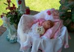 The one on the porch is my little redheaded gumdrop. and the other one is a blonde gumdrop. I just like her face, besdies she does look like my first grand daughter looked like. The new baby is a BB Lilly by Denise Pratt. Now as far as the bed. I bought it, but only to see how it's made and I've been collecting beautiful fabrics and imported lace from Ireland, Italy and France. I never thought I would want to do something like that, but it's just perfect as it's easy to move around...it's a laundry basket with a pillow matress and two smaller pilllows. I'll take some better pictures of it, but if you want one..wait for me to make some. I'm going to make it in Ivory Egyptian cotton with all the trimmings. Also to save you can pick up your own basket and that will cut down on cost. I got the basket with mine, so I had to pay higher S&H etc. I'll try to get pictures back in here tomorrow or Sunday. Thanks for the compliments to you all. *blushing*