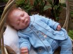 His hair was the new Secrist Angel mohair. It was really nice to work with. I intended to straighten it by spraying with conditioner and putting a sock on it, but it looked so cute curly I decided to leave it as it was.