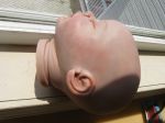 Hello Heather, I don't see much wrong with your baby Sam, the only thing I would suggest is that you cut some hairs out of your eyebrow brush so the strokes are not as thick. Also add another tone to them like Debra has suggested. I think too, to make him a little different add a few milk spots on his forehead, nose and cheeks with a little redness arround them, just to give him a special touch. XXXXXX June.