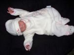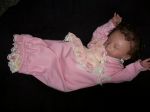 Thank you all. I think she is a little sweet thing also. I took her into Walmart and had the cashier coming over to hold her and there was quite a stir. Then at another store a lady came up and was just looking at her and I never like to go too long before telling them. She said 'She's just beautiful" and I said..she's a doll. Then she asked if she could hold her and I let her and she started checking her out all over..like going up her gown and looking at her legs and body slip etc. and then she asked 'how much would one go at this size and I said..around 140.00 or more..depending on her layette. She then said she was a doll collector and wanted to get my name and phone number and said she most likely will call and tell me what she would like....YIKES. Anyway I've already started another Faith and this one will be lighter complection and maybe red or blonde hair....I don't know and I won't until I have the paint cured and then comes the trying of of different colors. This second time around...it hasn't flowed so easily. I wonder why? Then after messing up my Step. Daughter's Shyann over some dark brown mohair..I got another head and then I'll be ^&^ if I didn't mess it up..will only with needing to fix the paint a bit, so I go and find some acetone fingernail wipes and they were red in color..figuring this meant nothing as it was a polish remover..well you guessed it...A BIG red wide stipe down the side of her face and I cannot get it off to save my life. grrrrrrrrrr rats. But...I'll get it done. I'm going to have to sell these babies....
