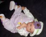 She's such a cute one!!! With such beautifully rooted hair, the only thing I might consider using to cover her head is that cute little hat with the purple flower.