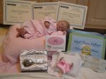 The sculpt is Marissa May's "Meg" from BB. It's still hard for me to believe this happened, not in my wildest dreams. I was hoping maybe I could win one 3rd place, if I got lucky. I was stunned. The Crystal Rattle and check for $200 is from Little Dreams. The brush and comb set is for "People's Choice"-Reborn of the Year". I tripped a little going up the stairs for the 1st award and by the time the 5th one was announced a friend thought I moght pass out. She's my 5th doll and took 2 months to make. Yippee, I'm thrilled and feel so honored. I want to thank you all for the encouragement and support I have received on this forum. Sandy McGee