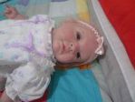 I think her coloring is just fine. I don't tihnk she has been over blushed at all. I do agree with Linda and Dee about her eye lashes. They for me are a tough one. I've done a few babies without them even and they came out just fine. I also tried setting them in with just a bit of glue just to tack the lashes in place then use liquid tears (paper glaze) over the entire eye giving them a glassy wet look and securing the lashes as well.